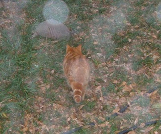 This past weekend I looked outside and there were the cats with the armadillo that lives under our deck. Atticus was following him around and Jem was poised on the roof watching the action below. It was one of those morning where everything was wet and it hadn't even rained. I guess that's one of the reasons why this is called a semi-tropical climate. Anyway, the A/C was running and keeping us nice and cool inside the house. I grabbed my camera and ran outside to get a picture. So many cute Kodak moments as the armadillo ran around and Atticus followed him. I was snapping away and this is what I got.